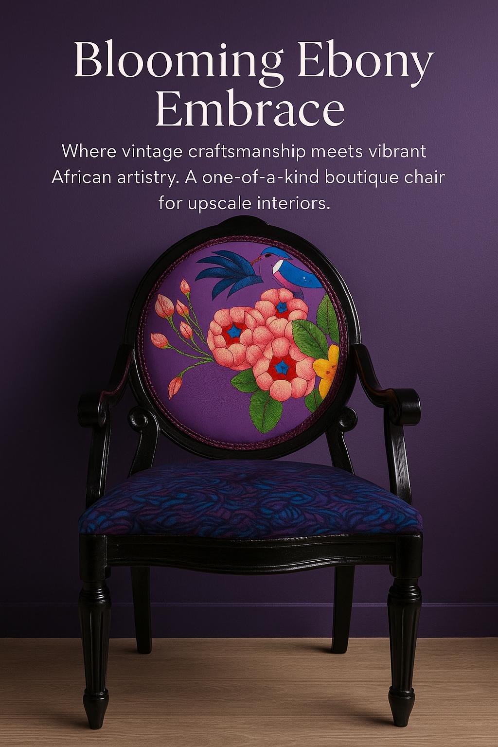 Elevate your interior with this luxury repurposed boutique chair, featuring a round backrest upholstered in authentic African wax cotton in a bold, royal purple shade. The hand-painted floral motif blooms with prominent pink flowers, lush green leaves, and a striking blue bird with a red eye, creating a one-of-a-kind statement piece for high-end interiors.