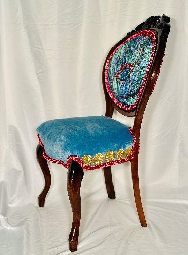 On the reverse side, the backrest stuns with a sophisticated design of intertwined loops, lines, and vibrant embroidery, offering visual depth and drama from every angle. The seat cushion, crafted from plush dark velvet fabric and trimmed in gold cord, adds richness and opulence, while the cabriole-style legs and elegantly curved frame highlight its vintage European inspiration.