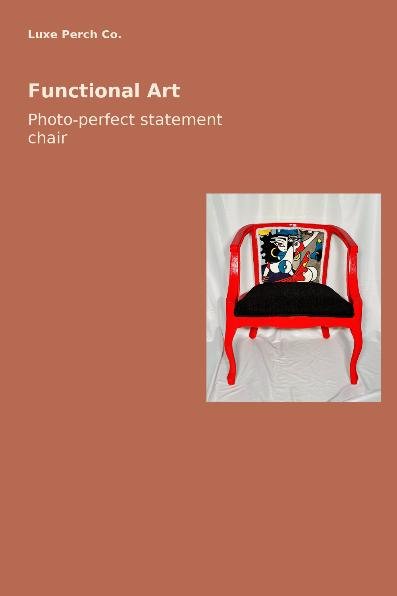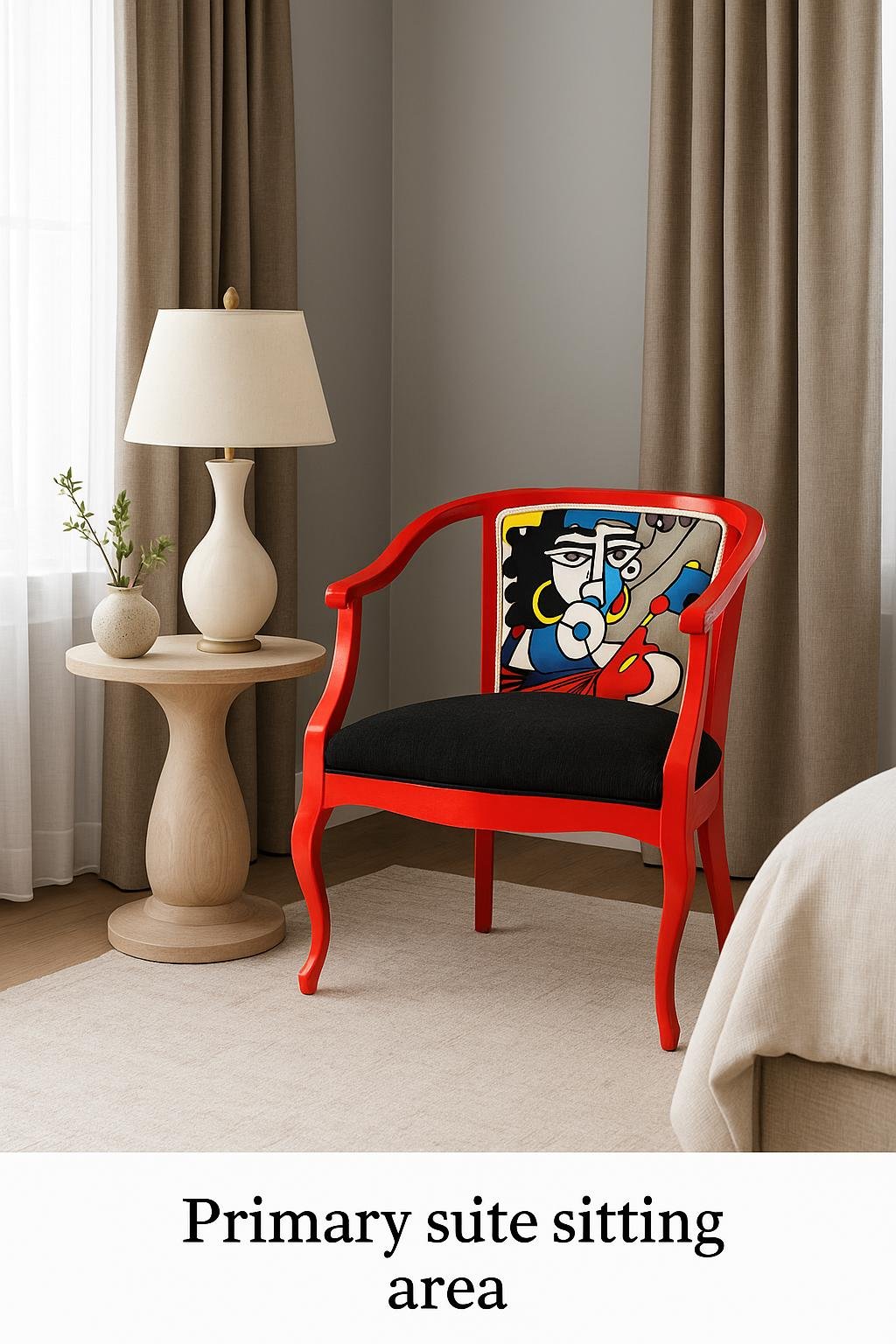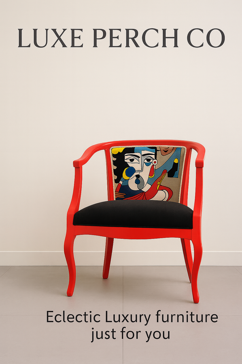 Handcrafted and repurposed for modern collectors, the Sexy Fire Tension Perch is a luxury red accent chair that doubles as gallery-worthy functional art. Its vintage hardwood frame is finished in a high-gloss fire-red lacquer with elegant, curved legs and sculpted arms. The front backrest showcases an embroidered abstract/cubist face—a bold, geometric composition in blue, yellow, white, and red that nods to the narrative of Isa Azzeitun’s Getting in Love (love as an “untamed force,” the pull between doubt and attraction). The rear panel reveals a second artwork: an intricate embroidered geometric mosaic—circles, waves, and rhythmic lines rendered in layered threads of white, beige, green, pink, red, and orange for couture texture from every angle. A sleek black seat grounds the composition, delivering plush velvet comfort and sharp contrast.