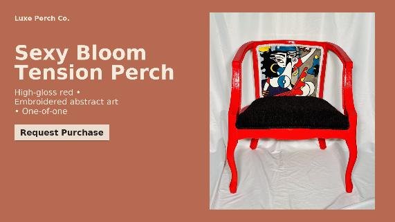 Designed for penthouses, boutique hotels, private galleries, high-end restaurants, and editorial studios, this one-of-one statement chair brings contemporary art, couture craftsmanship, and red-carpet drama to any room. If you source for interior designers with elite clients, this is the trade-ready hero piece that photographs beautifully, holds space, and ignites conversation.